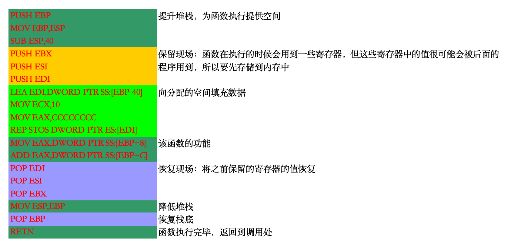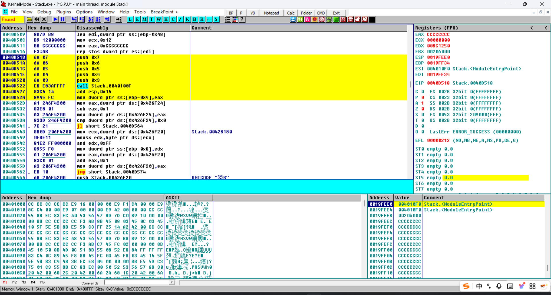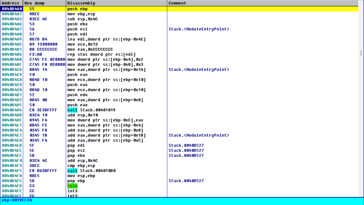 练习:嵌套函数堆栈图(Stack.exe 从 40D518 画到 40D52A,标黄部分)